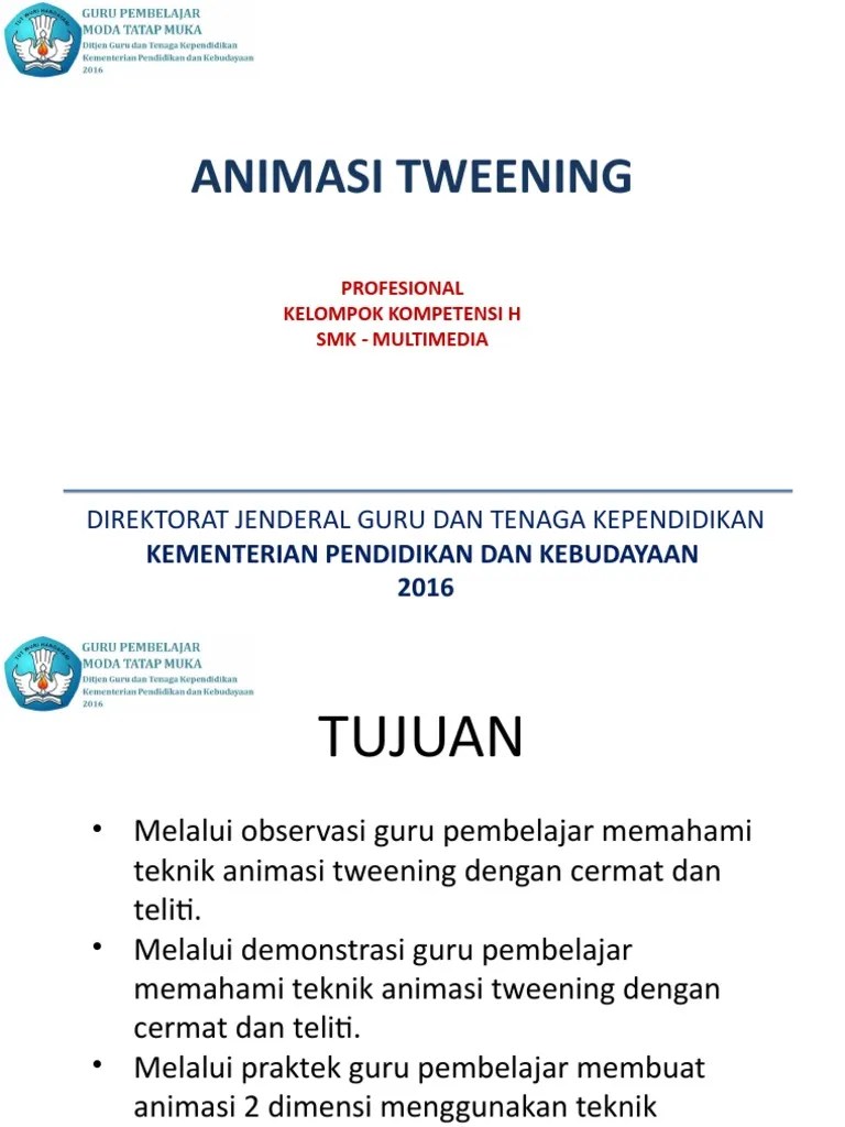 Tweening adalah proses membuat sebuah animasi pergerakan dengan cara memberikan perubahan pada bentuk atau posisi objek dengan menentukan keyframe awal dan . Secara garis besar, teknik animasi terdiri dari 2 jenis, yaitu teknik animasi frame by frame dan teknik . Tweening adalah sebuah proses membuat aniasi dengan cara memberikan perubahan pada bentuk mapun posisi objek dengan membentuk keyframe agar . Mampu membuat animasi 2d menggunakan teknik tweening. Adapun tujuan dari kegiatan pembelajaran mandiri pada kd 3.3 sebagai adalah sebai berikut: